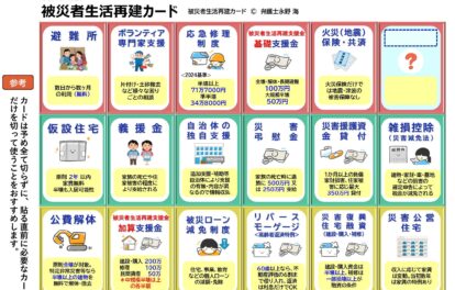 ワークショップに必要な準備➡ここからDL ①被災者生活再建カード(A4カラー印刷)のダウンロードはここをクリック (特別編)能登半島地震特別カード(A4カラー印刷)のダウンロードはここを … 続きを読む 【被災者生活再建カード(ゲーム)】 ボードゲーム形式で被災者支援制度の活用を学び、実際の支援もできるツール